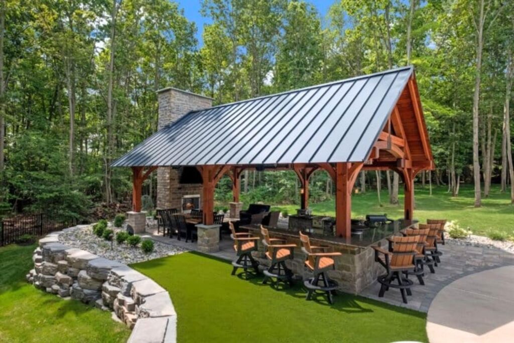 A professional-grade outdoor culinary pavilion is often found in high-end residential properties where entertaining is a priority. This setup includes multiple cooking appliances, expansive prep surfaces, and integrated dining areas. The pavilion structure provides shelter while maintaining an open-air feel.
